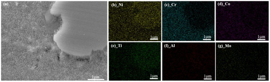 The GH4720Li alloy’s element distribution after OEI treatment (heated to 800 °C and maintained for 30 s). (a) SEM image of the alloy. Distribution of different elements in the alloy: (b) Ni. (c) Cr. (d) Co. (e) Ti. (f) Al. (g) Mo.