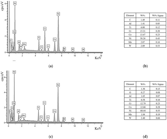 (a) The GH4720Li alloy’s energy spectrum (before OEI treatment); (b) the GH4720Li alloy’s element content table (before OEI treatment); (c) the GH4720Li alloy’s energy spectrum (after OEI treatment); (d) The GH4720Li alloy’s element content table (after OEI treatment).
