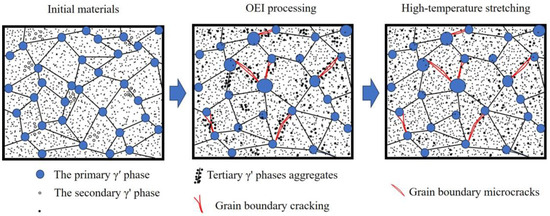 Changes in the microstructure of GH4720Li after exposure to different OEI treatment temperatures, as shown in Figure 13, reveal the influencing mechanism of the OEI state. The material’s microstructural changes after the OEI-state treatment at 800 °C-700 MPa-30 s are the most significant. During this process, the alloy produced many microcracks and accumulated a large amount of the tertiary γ′ phase at the grain boundaries. Due to the subsequent heating of the material to 800 °C for 20 min, the damage caused by the treatment decreased, resulting in little change in alloy strength but numerous microcracks that significantly reduced tensile elongation. Figure 14 shows the schematic diagram of its impact.