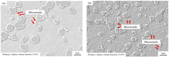 Figure 10 shows that, when the GH4720Li alloy is kept at 400 °C for 5 min, the volume fraction of the primary γ′ phase shows almost no change. Subsequently, the alloy was subjected to an OEI-state treatment at 800 °C-700 MPa-30 s, and the volume fraction of the alloy’s primary γ′ phase quickly dropped to 13.2%. After passing the OEI conditions, the alloy was subjected to a high-temperature tensile test at 800 °C. During the process of heating the material to 800 °C for 20 min, the volume fraction of the primary γ′ phase in the alloy was restored to a certain extent due to the thermal activation energy.