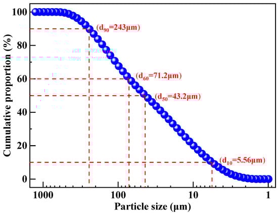 The particle size distribution of lead–zinc tailings is shown in Figure 4. It can be seen that the particle size of lead–zinc tailings is relatively fine, and the maximum particle size is less than 1 mm. The cumulative proportion of particles with size less than 75 μm reaches 61%, the average particle size is 89.5 μm, and the median particle size is 43.2 μm. The particle size composition of lead–zinc tailings used in this study meets the granularity requirement for preparing sintered ordinary bricks.