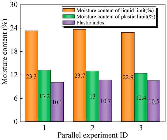 The plasticity index of lead–zinc tailings is shown in Figure 5. It can be seen that the average plasticity index is 10.4, and the index ranges from 7 to 15, which indicates medium plasticity. The plasticity index of tailings meets the requirements of fabricating sintered ordinary brick, and a better molding effect can be achieved when assisted by clay.