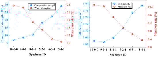 The performance indices of 16 specimens fabricated according to the orthogonal experiment table are shown in Table 4. It can be seen that the compressive strength of specimen A4B2C3D1 is the highest, which is 34.43 MPa. When used as a load-bearing brick, it meets the requirements of the MU30 level in the Chinese sintered ordinary bricks standard (GB/T5101-2017). When used as road bricks, it also meets the strength requirements of the MX category in the Chinese fired paving unit standard (GB/T26001-2010 [39]). Considering the requirements of environmental protection and construction in mining areas, the sintered bricks with lead–zinc tailings can replace the pavement bricks around the mining area. For all specimens, except for the slightly larger water absorption of A1B1C1D1, A1B2C2D2, and A2B1C2D3, the water absorption values of other specimens are all less than 17%, and thus meet the requirement. It can be found that the change in process parameters has little influence on mass loss rate and bulk density. Mass loss rate is mainly concentrated in the range of 9%~11%, and the bulk density is between 1.67 g/cm3 and 1.81 g/cm3.