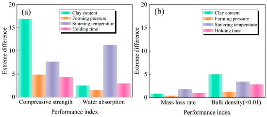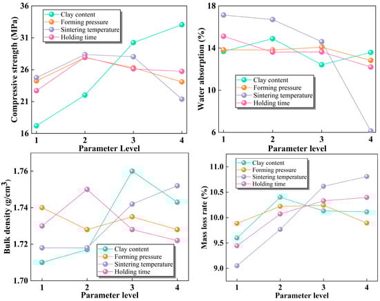 Ranges of the influences of the four process parameters on the performance index of sintered bricks are shown in Figure 9. It can be seen that the order of the influence of the four parameters on compressive strength of sintered brick is clay content > sintering temperature > holding time > forming pressure. The order of the influence of the four parameters on water absorption is sintering temperature > holding time > clay content > forming pressure. Careful selection of clay content and sintering temperature can optimize sintered bricks with better performance. The order of the influence of the four parameters on mass loss rate is sintering temperature > holding time > clay content > forming pressure. The sensitivity order of the four parameters on bulk density is clay content > sintering temperature > holding time > forming pressure. However, there is little difference between the range of these four parameters on mass loss rate and bulk density, indicating that the difference in the influence of these four parameters on mass loss rate and bulk density is not obvious. Overall, the sensitivity of the four performance indices to the variation in process parameters is in the order of compressive strength > water absorption > mass loss > volume density