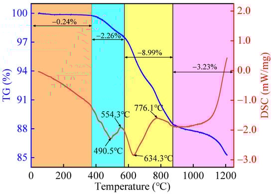 The thermogravimetry/differential scanning calorimetry (TG-DSC) curves of lead–zinc tailings are shown in Figure 10. It can be seen from the TG curve that lead–zinc tailings show a trend of weight loss during the sintering process, and the cumulative mass loss rate is 14.72%. The mass loss process can be divided into four stages: (1) The temperature rises from room temperature to around 370 °C during the first stage. The TG curve declines slowly in this period, and the cumulative mass loss rate is only 0.24%. The mass loss at this stage is mainly caused by the evaporation of adsorbed water and crystal water. However, the specimen was dried before thermal analysis, and part of the adsorbed and crystalline water was discharged, so the mass loss rate was small. (2) The second stage corresponds to the range in the sintering temperature from 370 °C to about 575 °C. The TG curve begins to decrease obviously, while the DSC curve shows obvious exothermic and endothermic peaks. The exothermic peak at about 490.5 °C may be caused by the combustion of organics contained in lead–zinc tailings, and the endothermic peak at about 554.3 °C is mainly related to the decomposition of pyrite and silicate, and is also affected by the quartz phase change. The quality of quartz does not change during the phase change, but the combustion of organic matter, and the decomposition of pyrite and silicate, will cause mass loss. (3) In the third stage, the sintering temperature rises from 575 °C to 870 °C. The DSC curve shows an obvious peak, and mass loss rate of lead–zinc tailings at this stage is the largest, about 8.99%. It is speculated that the exothermic peak is caused by the further oxidation of pyrite decomposition products, and the endothermic peak is mainly caused by the decomposition of carbonate minerals in lead–zinc tailings. Due to the high content of carbonate minerals in lead–zinc tailings, the mass loss increases significantly at this stage. (4) The sintering temperature above 870 °C corresponds to the fourth stage. In the early part of this stage, the mass loss is relatively slow, and the DSC curve also increases slowly, indicating that the internal changes in lead–zinc tailings are mainly melting, which stay in a stable sintering process. However, when the sintering temperature is higher than 1150 °C, the mass loss rate of tailings is intensified, and there exists an endothermic peak, which may be caused by the decomposition of aluminosilicate minerals.