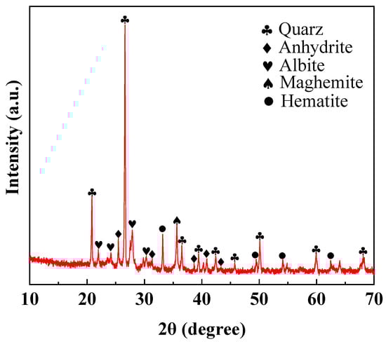 XRD and SEM experiments were carried out on sintered ordinary bricks prepared under the optimal combination of process parameters. The phase compositions of sintered ordinary brick are shown in Figure 11. It can be found that the main minerals in sintered ordinary bricks from lead–zinc tailings are quartz, anhydrite, albite, maghemite, and hematite. Comparing pre- and post-sintering XRD patterns (Figure 2 and Figure 11), it can be seen that the diffraction peaks of mica, dolomite, pyrite, chlorite, and calcite in lead–zinc tailings disappeared, while the diffraction peaks of anhydrite, albite, maghemite, and hematite appeared. This indicates that chemical reactions occurred in minerals during the sintering process. According to Table 2, raw materials contain Na2O, Al2O3, and SiO2, which can be used to form NaAlSi3O8. Mica (KAl2(AlSi3O10)(OH)2) is mainly decomposed into SiO2, Al2O3, K2O, and H2O. Dolomite is decomposed into CaO, MgO, and CO2. Pyrite is oxidized to Fe2O3 and Fe3O4, and then Fe3O4 is eventually oxidized to γ-Fe2O3 (maghemite) during the cooling process (around 220 °C). Chlorite (Al4Si4O10(OH)8) is decomposed into Al2O3, SiO2, and H2O, and calcite is decomposed into CaO and CO2. The decomposed CaO reacts with SO2 to form CaSO3, which is further oxidized to CaSO4. The minerals in the sintered bricks are responsible for the mechanical properties. The mica in lead–zinc tailings is decomposed into SiO2 and Al2O3 during the sintering process, which participate in the formation of quartz and albite to improve the uniaxial compressive strength of bricks. The relevant chemical equations are expressed as: