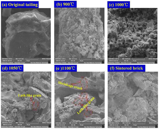 SEM images of lead–zinc tailings and sintered brick: (a) raw lead–zinc tailings; (b–e) lead–zinc tailings at sintering temperature of 900 °C, 1000 °C, 1050 °C, and 1100 °C, respectively; (f) sintered brick with optimal process parameters.