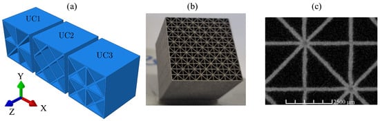 (a) The architectures of the three considered plate lattice cells, UC1, UC2, and UC3, (b) an exemplary specimen measuring 30 × 30 × 30 , composed of unit cells of type UC1 fabricated using the LPBF process, and (c) CT scan of the specimen.