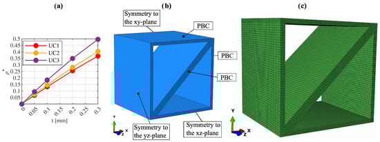(a) Relative density , (b) geometric boundary conditions using three planes of symmetry, and (c) discretization of reduced model of unit cell UC1.