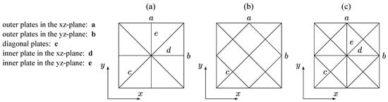 Isoparametric linear hexahedral solid elements with an average element size of are employed. A minimum of 4 elements are used through the wall thicknesses. A mesh convergence test showed that a further refinement of the discretization does not result in a significant change in the results. Particular attention is paid to minimizing distortion of the elements, especially in the areas of the plate intersections. Specifically, with the hexahedral elements used, no angles smaller than 50° or larger than 140° are used, and an aspect ratio below 5 is employed. Figure 2c shows the discretization of the reduced model of unit cell UC1. A comparison with solid elements with quadratic shape functions shows that the differences in the resulting effective stiffnesses are in the range of 1%.