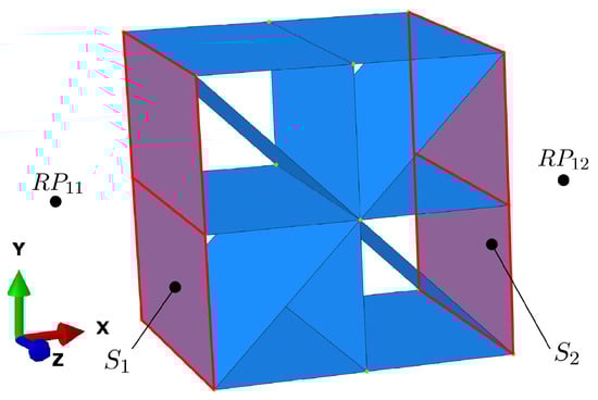 In particular, the translational degrees of freedom of the nodes of faces and are coupled to those of reference points and , respectively. The rotational degrees of freedom are not coupled, allowing the plates oriented in the load direction to rotate. All translational degrees of freedom of are set to zero, and the degrees of freedom and of are set to zero. A unit pressure force in the x-direction is specified at the free degree of freedom of . This way, all nodes on side undergo the same displacement in the x-direction, as they are coupled to the corresponding displacement of the reference node. This very simple modeling approach corresponds to a cell that is clamped between two plates and is compressed.