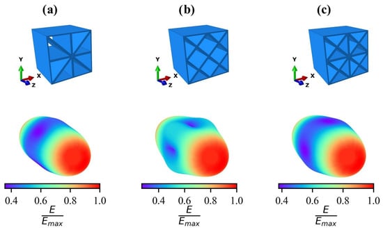 The color scale shown is normalized to the maximum occurring modulus of elasticity. It is clearly recognizable that all three unit cells show a maximum value of the modulus of elasticity in the z-direction. These maximum values coincide, with a deviation smaller than 1%, to the values determined through the Voigt bound [61], which was applied for cellular materials by [62] and provides the effective modulus of elasticity for the parallel connection of two isotropic linear elastic materials, which are, in the present case, AlSi10Mg and a gas. This confirms that the elastic material properties of the lattice structures can be accurately captured using volume elements. The dominance of the effective stiffness in the z-direction is due to the fact that all the plates of the cells are oriented in this direction. For cells UC2 and UC3, the minimum elastic modulus (dark purple areas in Figure 5a–c) occurs perpendicular to the z-axis in the x- or y-direction and, for cell UC1, at a rotation angle of 45° about the z-axis. This corresponds to a load on cell UC1 in the direction of the diagonal plates. Cell UC2 (Figure 5b) shows a local maximum in the direction with a rotation of 45° about the z-axis. This is due to the fact that all internal plates of cell UC2 are oriented in this direction. In contrast, a local maximum occurs in cell UC1 in the x- and y-directions, as the majority of the plates are oriented in these directions. In cell UC3, there is again a local maximum in the direction with a rotation of 45° about the z-axis, as the diagonal plates make a greater contribution to the stiffness than the horizontal or vertical plates.