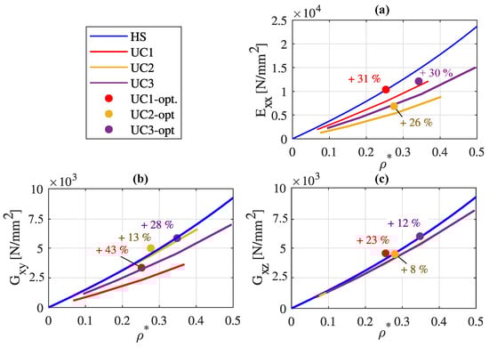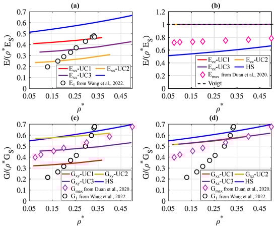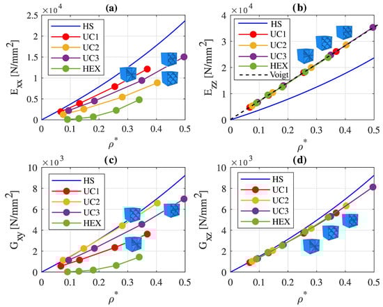 Additionally depicted is the upper Hashin–Shtrikman bound, representing an upper limit for the maximally attainable elastic material constants of an isotropic cellular material [41], along with the effective material constants of a honeycomb cell. The points represent the specifically determined values for different wall thicknesses. Linear interpolation was applied between these points. In Figure 6a,b, the effective Young’s moduli and are presented as a function of the relative density. Figure 6c,d depict the shear moduli and as a function of the relative density. Due to the symmetry of unit cells UC1, UC2, and UC3, it holds that and .