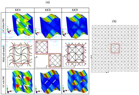 The three unit cells each exhibit a deliberately chosen arrangement of plates, ensuring that each cell is particularly well suited for specific loading conditions. This is achieved by orienting the plates in the direction of the principal stresses. The z-axis represents the axial direction for all cells. In cell UC1, three plates are oriented in the xz-plane and three plates are oriented in the yz-plane because the x- and y-directions represent the principal stress directions under tension or compression along these axes. The additional diagonal plates are included to provide some stiffness against inevitable variations in the direction of loading. In contrast, for cell UC2, most of the plates are oriented at 45° to the x- and y-axes, corresponding to the principal stress direction for shear loading in the xy-plane. The surrounding plates oriented in the xz- and yz-planes in cell UC2 allow for a superposition of additional tensile/compressive loads in the transverse directions. Cell UC3 represents a superposition of cells UC1 and UC2 and is suitable for tensile/compressive loading in the x-, y-, and z-directions, as well as for shear loading in the xy-, xz-, and yz-planes. From Figure 1a, it is evident that unit cell UC3 is composed of four repeating smaller structures. It would thus be possible to consider UC3 using an even further reduced model as an RVE. As Section 4.2 will demonstrate, forgoing further reduction proves advantageous in the stability analysis.