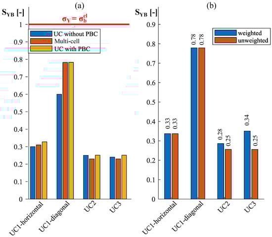 For the elastic modulus represented in Figure 6b, it is observed that UC1, UC2, and UC3 reach nearly identical values. The additional plates in UC2 and UC3 contribute to increased stiffness; however, this effect is counteracted by the additional material volume, resulting in more weight. This aligns with the Voigt bound [61], stating that the effective Young’s modulus of a composite of two materials connected in parallel depends solely on the elastic properties of the individual constituents and their volume fraction.