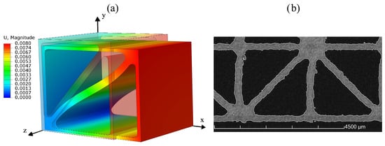 Due to the characteristic structure and thin-walled nature of lightweight lattice structures, further research is required regarding their stability behavior. Numerical and experimental investigations on this matter were conducted in studies such as [21,45,46] and carried out in [21,46] using nonlinear Finite Element Method (FEM) analysis. The FEM simulations performed in [21,45,46] depict a finite lattice structure that is compressed between two supports, simulating a compressive test scenario without using a RVE with PBCs.