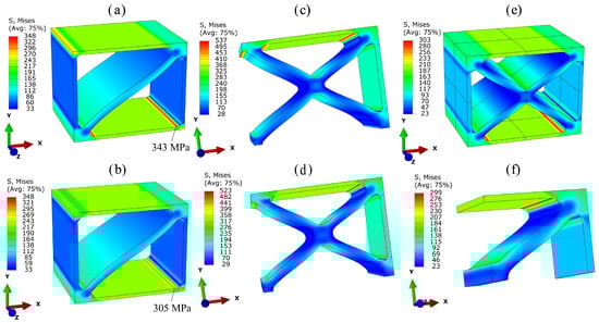 is defined. The term represents the maximum local von Mises equivalent stress occurring in each of the three lattice cells under the application of the same macroscopic stress . The term is the relative density of the unit cell altered due to the radius. The larger the value of , the lower the weighted stress resulting from the loading, and the higher the expected specific strength of the lattice structure. The factor 100 is merely a multiplicative constant in order to obtain easily representable values. The resulting values are depicted in Table 6 depending on the selected radius R. It can be observed that cell UC1 exhibits the highest specific strength, while cell UC2 has the lowest. The chosen radii have little influence on the specific strength. This is due to the fact that the maximum stress occurs at an intersection point in all three cells, where the same radius is maintained in both variants. This results in only minimal changes to the maximum stress, which are largely compensated for by weighting with the relative density .
