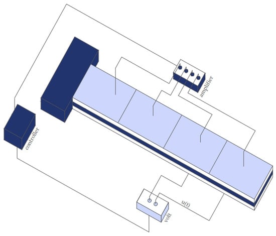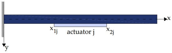 Figure 1 and Figure 2 illustrate a smart beam with an integrated piezoelectric actuator that outputs a mechanical force when given an electrical input [,,,,,,]. The electric force fe(t,x) of the piezoelectric activator was determined as follows: