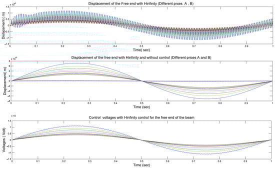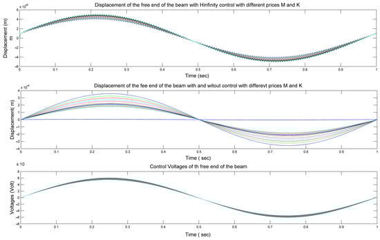 In Figure 8, we present a comprehensive analysis of the displacement behavior at the free end of our smart beam under varying conditions of parameters mp and kp, as represented by matrices A and B in Equation (23).