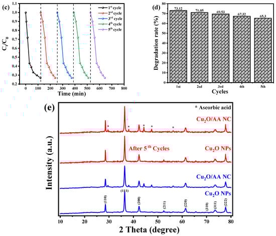 The recyclability of Cu2O NPs and Cu2O/AA NPs photocatalysts for degradation of BCB dye. (a) Cu2O NPs, (c) Cu2O/AA NPs, dotted line detain the start point of the Cycle and the next cycle and (b,d) reusability (degradation) efficiency vs. number of cycles in the photodegradation of BCB dye by Cu2O NPs and Cu2O/AA NPs, respectively. (e) XRD analysis of Cu2O NPs and Cu2O/ASA NPs of pure and reused.