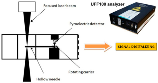 The Prometec UFF100 laser beam analysis system is used to determine the laser beam power density distribution and the caustics of the laser beam (Figure 2). The UFF100 is a diagnostic device for measuring and monitoring the laser beam of high-power lasers. It scans a laser beam through a measuring element—a hollow needle. On its surface, on the side of the incidence of the laser beam, a hole is drilled to allow the laser beam to enter the center of the needle. The rotating needle is introduced into the area of the laser beam. The laser beam enters the hollow needle and is transported to the detector. The rotation of the needle in the plane perpendicular to the axis of the laser beam enables it to be scanned along the trajectory of the needle opening. The precise needle-shifting system enables the beam to be shifted along its cross-section in several different cross-sectional planes.