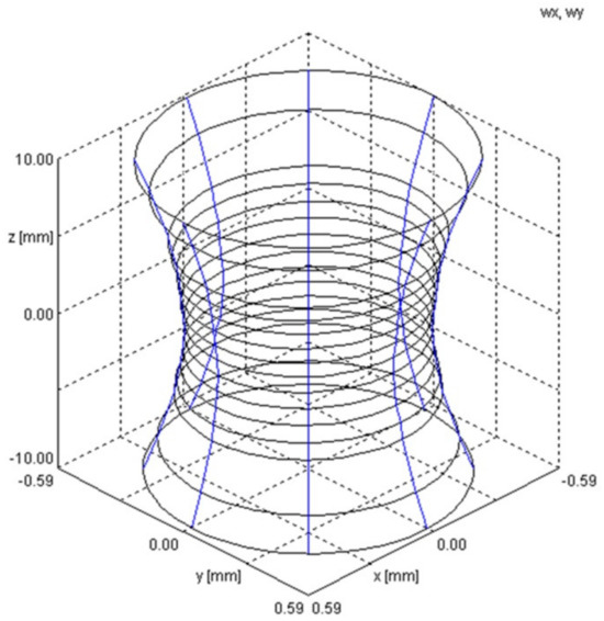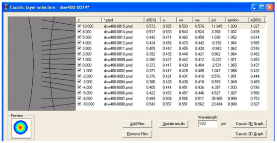 Table 1 shows the measured distribution of the Yb:YAG laser beam (as percentages) for two different focusing conditions. Figure 4 illustrates laser beam caustics for radii wx and wy in the plane (x, y), according to norm PN-EN ISO 11146 [41].