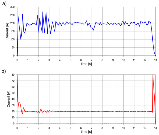 Electric arc current and voltage are constantly measured and presented on the machine monitor during the welding tests. Measurements are also written into a local database for further use. Figure 5 presents a picture made on the computer screen responsible for monitoring the current and voltage during the process. The energetic parameters of the arc are stored in the machine database and further transferred as digital data (as a time-parameter relationship) into the computer solver.