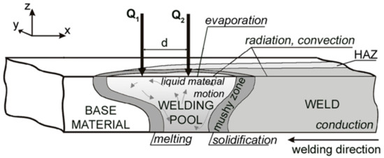 Heat transfer mostly depends on convection and conduction. In the HLAW process, two heat sources cooperate in a single welding pool [22,25]. Fluid flow in the fusion zone is generated by electromagnetic force, Marangoni shear stress, arc forces, recoil pressure, surface tension, buoyancy forces, etc. [26,27,28]. In this study, we consider the Marangoni effect with a surface tension diagram depending on temperature, in accordance with the research presented in [28,42,43], and buoyancy forces in the FZ. Material between the solidus and liquidus temperatures as a mixture of solid particles and liquid steel (the so-called mushy zone) is assumed to be a porous medium according to Darcy’s equations. Phase transformations occurring in the mushy zone and at high temperatures above the boiling point of steel are taken into account (solid–liquid and liquid–gas transformations). A three-dimensional model of the HLAW process is presented in Figure 8.