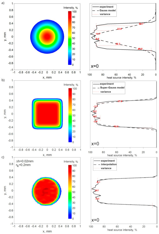Welding is a sophisticated technological process accompanied by many physical phenomena, especially when using a laser beam as a heat source to penetrate the material. There is a noticeable difference between the distribution of the Gaussian-like TEM00 laser beam and the Yb:YAG solid-state laser, which is shown in our experimental research (see Table 1). The aim of developing the interpolated model was to accurately reproduce the power distribution of the Yb:YAG laser beam based on experimental research conducted on the analysis of the energy profile of the solid-state laser beam. Figure 9 shows the differences between the standard Gaussian distribution (Figure 9a), the Super-Gaussian distribution (Figure 9b), the interpolated model (Figure 9c), and the results of the measurement. As it can be observed, the differences between the distribution of the standard Gaussian model and the experimental results are significant, up to 34%. The Super-Gaussian distribution corresponds with the results of the measurement on the x-axis or the y-axis, but the characteristics of the distribution have changed from a plane to a non-circle distribution. This non-circle distribution does not correspond to the real distribution of the laser beam (see Table 1). Moreover, none of the analytical models allows for the mapping of local extrema existing in the distribution of this laser beam. It is desirable to use the experimental data in numerical modeling to properly map the real energetic conditions of the process. Therefore, the results of the measurements of the Yb:YAG laser beam profile are used in this work in the interpolated heat source model.
