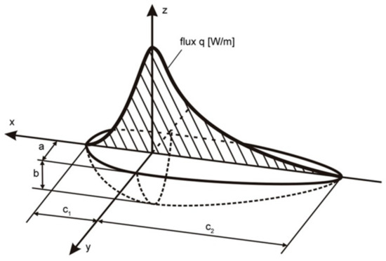 Goldak’s heat source [39] is used to describe an electric arc heat source (Equation (14)). This ‘double-ellipsoidal’ model glues together two half-ellipses using a semi-axis (Figure 10).