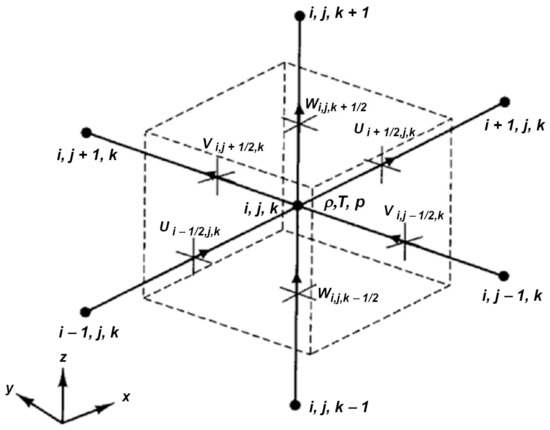 The authors developed a solver for the analysis of physical phenomena accompanying welding processes using the Object Pascal programming language. The solver is composed of two modules for estimating the velocity field in the melted zone, determined by the solidus temperature (Ts) and the temperature field. A staggered grid is used in spatial discretization to ensure the stability of the algorithm in terms of the odd–even decoupling between velocity and pressure. The vectors of velocity are determined at the center of the faces of the control volume. Pressure, density, and temperature are calculated in the center of the control volume. Figure 11 presents the elementary control volume on a staggered grid.