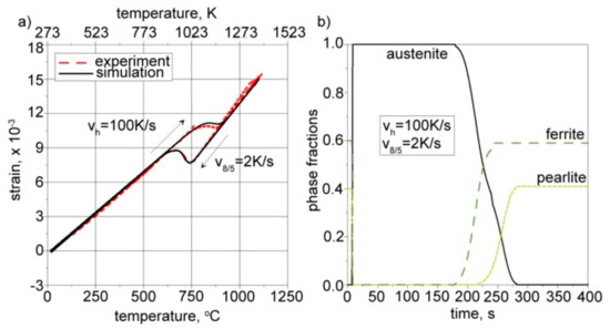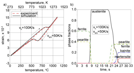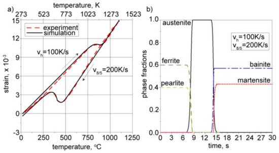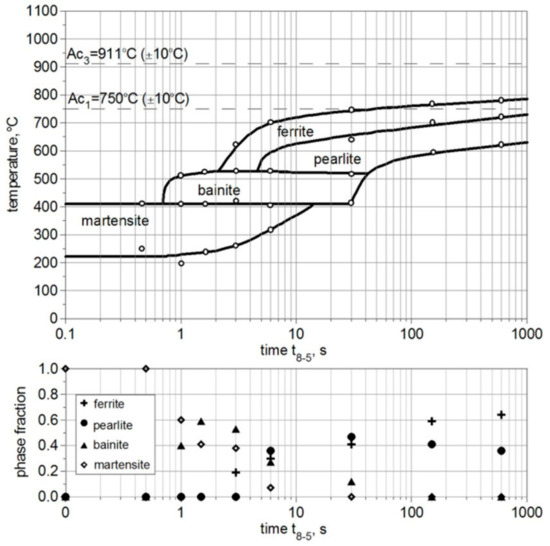 The use of interpolation functions and the results of our experimental research (dilatometric analysis) allowed us to describe the CCT diagram and implement the model of phase transformations in the solid state in terms of the kinetics of phase transformations and isotropic strains (see Figure 13 and Table 3).