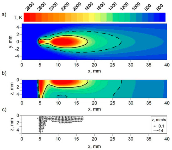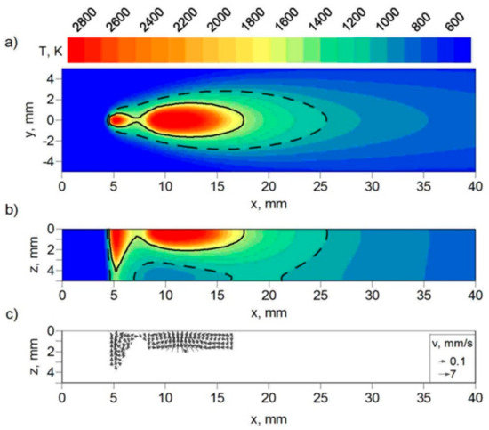 Field of temperature (a) at the top surface (z = 0), (b) in longitudinal section (y = 0) of the joint, and (c) melted material velocity field in longitudinal section (y = 0). Laser beam focusing: z = 5 mm.