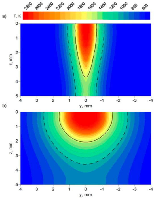 The temperature distributions in the cross-section of the weld are presented in Figure 16 and Figure 17. Two sections are presented in these figures, with the FZ boundary marked by a solid line and the HAZ boundary marked by a dashed line. These two sections correspond to the deepest penetration made by the leading laser beam (x = 5.4 mm) and the widest FZ area generated by the following electric arc (x = 12 mm) in the tandem. The results of the temperature field for beam focusing at z = 5 mm show that only partial material melting is achieved (Figure 17).