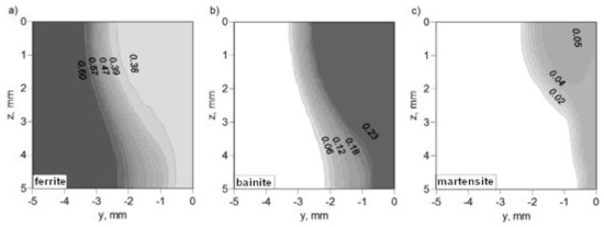 Prediction of structural composition of welded joint for beam focusing at z = 5 mm: (a) volume fractions of ferrite, (b) volume fractions of bainite and (c) volume fractions of martensite.