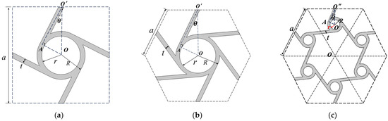 Figure 1b illustrates the chiral lattice geometric cell with the six ligaments, where the wave vector positioning on the periodic boundary differs from that of the square lattice. The midpoint of each side of the hexagon represents the center of the ligament. Parametric modeling can be established using geometric relations, with the edge length a of the unit cell set at 1 m. The ligament is tangent to the central node. Therein, , , and . Similar to the lattice with four ligaments, the center of the ligament is the midpoint of each side of the hexagon.