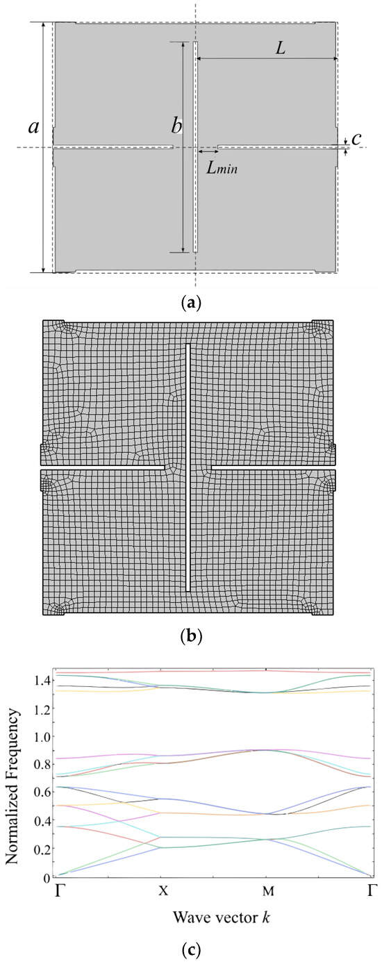 To verify the accuracy of the finite element method calculations, validation was performed using the ultra-low porosity structure material studied in [33]. This structure consists of rectangular holes intersecting each other on a flat plate, with the unit cell structure shown in Figure 2a. Figure 2b shows the mesh of the structure. We use a quadrilateral grid to divide the model. And the number of the finite elements are 2703. The band structure is shown in Figure 2b. We present the band diagram using COMSOL5.6, with identical porosity values, ψ = πab/L2 = 0.05 and a/b = 52.7, where ψ represents the aspect ratio of rectangle pores, L is the center-to-center distance between adjacent pores, and a and b are the major and minor semiaxes of each pore, respectively. The material’s Young’s modulus E is 1750 MPa, the material’s density ρ is 1174 kg/m3, and the Poisson’s ratio ν is 0.35. When the porosity of the unit cell structure is set to φ, a, b, and c, finite element analysis is carried out. The calculation results are expressed in reduced frequency fc = fa/c, where a is the lattice constant and c is the shear wave velocity. By comparing the result presented in Figure 1c with the literature [34], it can be observed that the trends of characteristic frequencies in the band structure are consistent, and the widths of the band gaps perfectly match with them. Letters Γ, X, and M in Figure 2b represent the high symmetric point of the irreducible Brillouin region, which can be found thoroughly explained in reference [35]. Different color lines indicate different dispersion relationships. The result demonstrates the accuracy of calculating band structures using the finite element method.