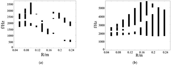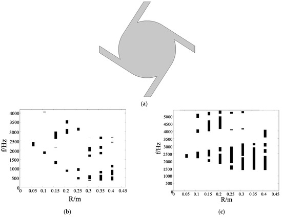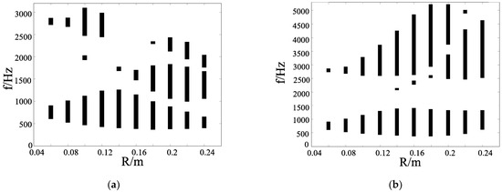 Figure 7 shows the band gap properties of the vertical triligaments structure with the different radius R of the center node. As shown in Figure 7a, with the increase in the radius of the central node, the passband between the band gaps expands, the width of the first band gap narrows, and the width of the other band gap increases. When the radius reaches around 0.1 m, the width of the second band gap is wider and the band gap is more ideal. However, with the increase in the radius of the central node, the band gap characteristics of the structure change greatly. It can be seen that when the radius is 0.12 m, the band gap width of the structure is narrower than that of the structure on both sides. When the radius of the central node is around 0.14 m, the band gap frequency is low and the width is good. As the radius size of the central node continues to increase, it can be found that no more ideal band gap appears.