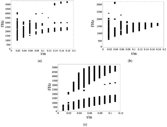 Figure 4 shows the band gap properties of the six-ligament structures. In Figure 4a, considering the rationality of the structure, the width t of the ligament is calculated from 0.05 m to 0.66 m, with 0.05 m as the step length based on the condition of t = 0.05 m. When the central node is hollow, the structures are similar to that of four ligaments. After becoming solid structures, the band gap distributions are relatively centralized. It can be seen in Figure 4b that the band gap width of the structure gradually increases by increasing the radius of the central node, except for when the radius of the central node is small, the band gap of the structure is small and not very satisfactory. The band gap widths of the structure gradually rise with the increasing radius of the central node.