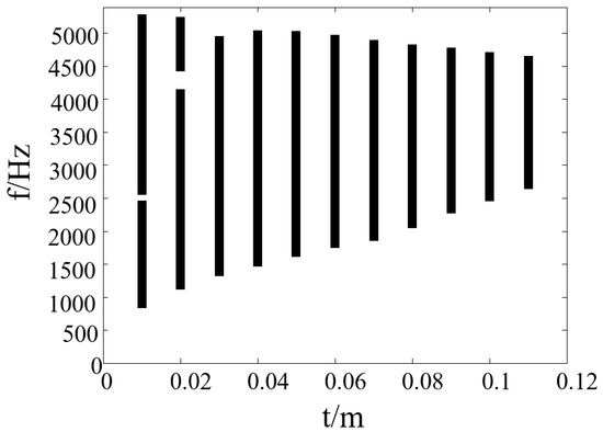 Through the analyses in Section 3.1, we found that the band gap of solid structures is more centered than that of hollow structures. In this study, the “centered band gap” describes that the band gap width is large, while the spacing between the band gaps is small, creating a more centralized appearance. Therefore, in this subsection, we investigate the effect of different ligament widths t of solid ligament structures on the band gap properties. For the four-ligament structures, as shown in Figure 3b, when the radius of the center node is 0.36 m, the width of the first band gap is 1505 Hz, which is an ideal width. Under this condition, the ligament width is changed to observe the change in its band gap. Also, considering the rationality of the structure, it is calculated here that the ligament width is increased from 0.02 m at an interval of 0.02 m to 0.18 m.