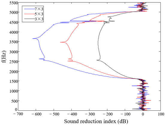 In this section, we study the attenuation effect of different period numbers on elastic waves. The transmission equation can be expressed by , where is the excitation point displacement amplitude, is the response point displacement, and is the sound reduction index. Figure 9 shows the 3 × 3, 5 × 3, and 7 × 3 vertical triligaments period structure, respectively. The 3 × 3 here refers to the 3 horizontal and 3 column periodic structure. The 5 × 3 and 7 × 3 are similar. Unlike ligaments with chiral structures that are tangential to a circle, vertically structured ligaments refer to ligaments that are vertical to the corresponding tangential line. Letters d and r denote the excitation source and the receiver, respectively. The boundary condition is the free boundary. The direction of excitation and response is transversal.