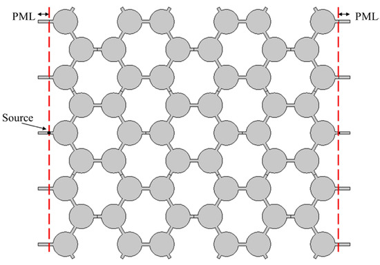 In this study, we analyze the unit cell of a two-dimensional periodic structure and explore the band gap characteristics of lattice structures using the Bloch–Floquet theory [30]. We examine band diagrams for periodic lattices with varying ligaments and geometric parameters, providing a comprehensive evaluation and discussion of the results. In this study, only propagating waves are computed (i.e., real part of wave number). Moreover, some scholars have also studied the characteristics of evanescent waves (i.e., imaginary part of wave number) for 2D honeycomb structures [31,32]. A viable modeling approach for altering the structural geometry while maintaining the unit cell’s size is presented.