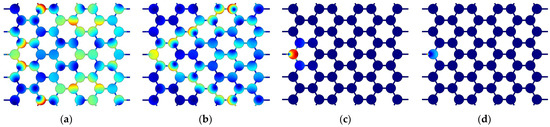 The harmonic response analysis aims to evaluate how a structure responds to a simple harmonic load with known frequencies. In this investigation, simple harmonic loads are applied at frequencies corresponding to the passband and band gap of the structure to examine the displacement response and validate the band gap calculation. Figure 12 shows the harmonic response model. There are Perfect Matched Layer (PML) boundaries on the left and right sides of the model, which indicates that the wave is infinite in the transverse propagation region. The upper and lower boundaries are free boundaries. Similar to the chiral triligaments structure, three propagation cycles are computed in the propagation direction. It has been established previously that the band gap frequency range of the symmetric triligaments structure spans from 1616 Hz to 5028 Hz. Consequently, two frequencies from the passband (500 Hz and 1000 Hz) and two frequencies from the band gap (2000 Hz and 3500 Hz) are specifically chosen for analysis. The resulting displacement response is illustrated in Figure 13 below. Similar to Figure 11, the redder the color of the cloud image, the larger the displacement, and the bluer the color, the smaller the displacement.