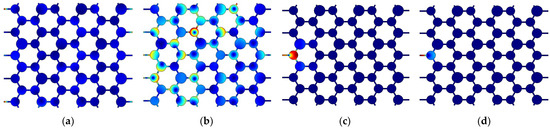 Similar to the original symmetric triligaments structure, the harmonic response displacement diagrams for 500 Hz, 1000 Hz, 2000 Hz, and 3000 Hz can be observed in Figure 14. The meaning of cloud image colors is similar to Figure 13. Despite the non-uniformity in the node sizes of the structure, it exhibits a notable vibration isolation effect, particularly within the specified frequency band gap. The vibration isolation performance remains robust across the mentioned frequency range. Consistent with the symmetric structure, the harmonic response analysis is conducted over a period of 3 × 3 cycles. The locations of the excitation points and response points remain unchanged from the previous structure, ensuring consistency in the analysis approach.