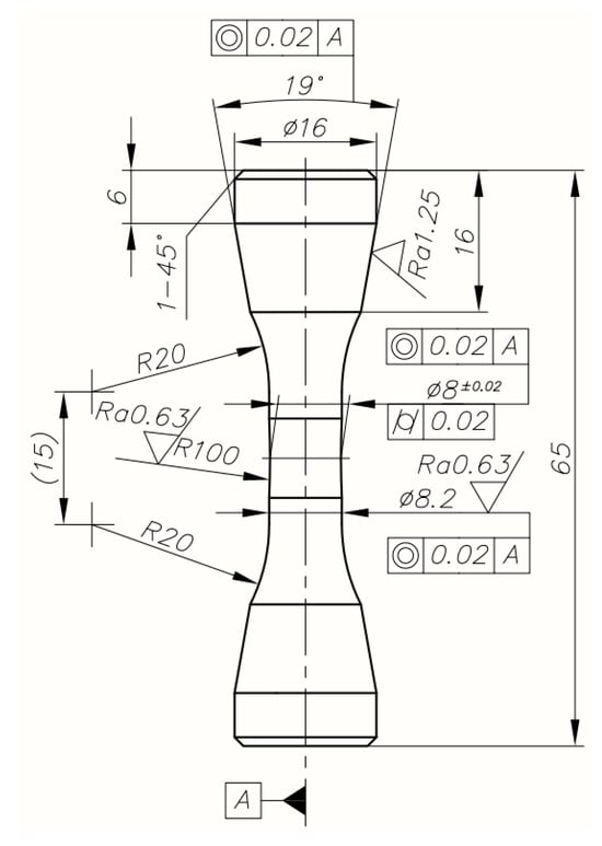Geometrical details of the specimen are shown in Figure 1. Conical ends provided co-linear fixing, high rigidity and prevented the specimens from sliding in the jaws of the hydraulic machine when testing the very hard material. All specimens were placed in the testing machine using specially designed and fabricated mounting devices. A grinding allowance, left in the central part of all specimens, made it possible to prepare the surface properly for LCF testing.