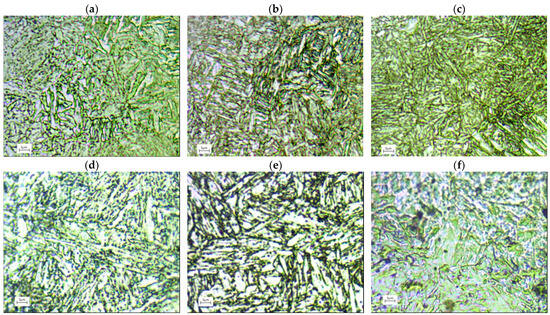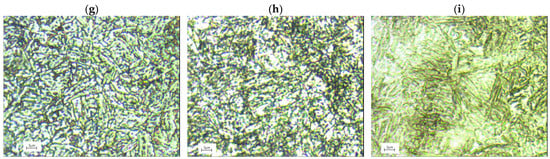 34CrNiMo6 steel met the performance requirements after appropriate heat treatment consisting of quenching and tempering at high temperatures []. After oil quenching of the samples (heated at 850 °C for 45 min) and tempering at 700, 620 and 500 °C for 20 min by air cooling, the microstructure of the samples was mainly homogeneous tempered martensite (Figure 2g–i).