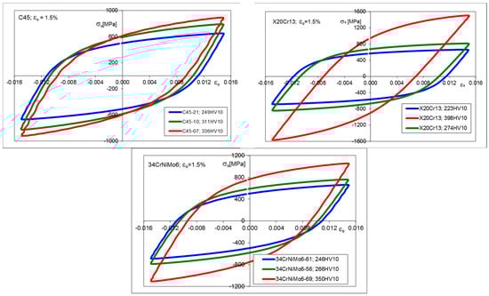 Stress–strain hysteresis loops for C45, X20Cr13, and 34CrNiMo6 steels, corresponding to 50% Nf, for εa = 1.5%.