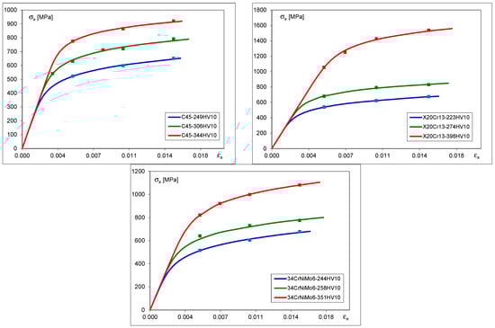 Cyclic stress–strain curves for C45, X20Cr13 and 34CrNiMo6 steels.