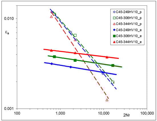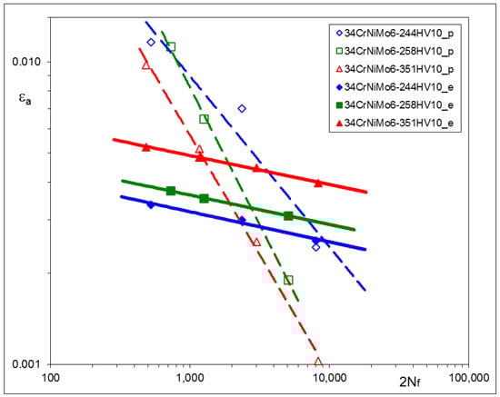 Other sets of experimental results, obtained from LCF tests, are represented by strain–life characteristics based on stabilized loops for 0.5 Nf and depicted for particular materials in Figure 5, Figure 6 and Figure 7. For convenience, corresponding pairs of elastic and plastic strain amplitudes are shown separately. In such a way, the mutual proportions between elastic and plastic parts of strain amplitudes are clearly seen, and the Manson–Coffin–Basquin Formula (2) may be applied as the mathematical representation of experimental results [] as follows: