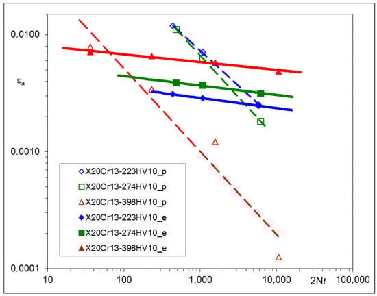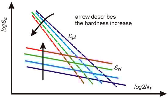 The plastic parts of the strain–life characteristics diminish and rotate (Figure 11), while the material hardness increases, which means that plastic strength exponent c changes due to the heat treatment. Unfortunately, the structural stress parameter σ* cannot be directly used in this case. However, the plastic part of the displacement amplitude εap, which applies in the Manson–Coffin–Basquin formula, can be derived from the Ramberg–Osgood equation, considering the known elastic strain component.
